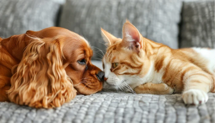 Cachorro e gato deitados em um sofá cinza para representar a palavra-chave ração quatree cães.